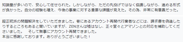 アカウントヘルス問題を解決した事例は数え切れないほどありますが、そのいずれも「正攻法」で解決を目指しています。Amazonを騙すような裏技(偽造領収書)などは一切使わずに回復しています。