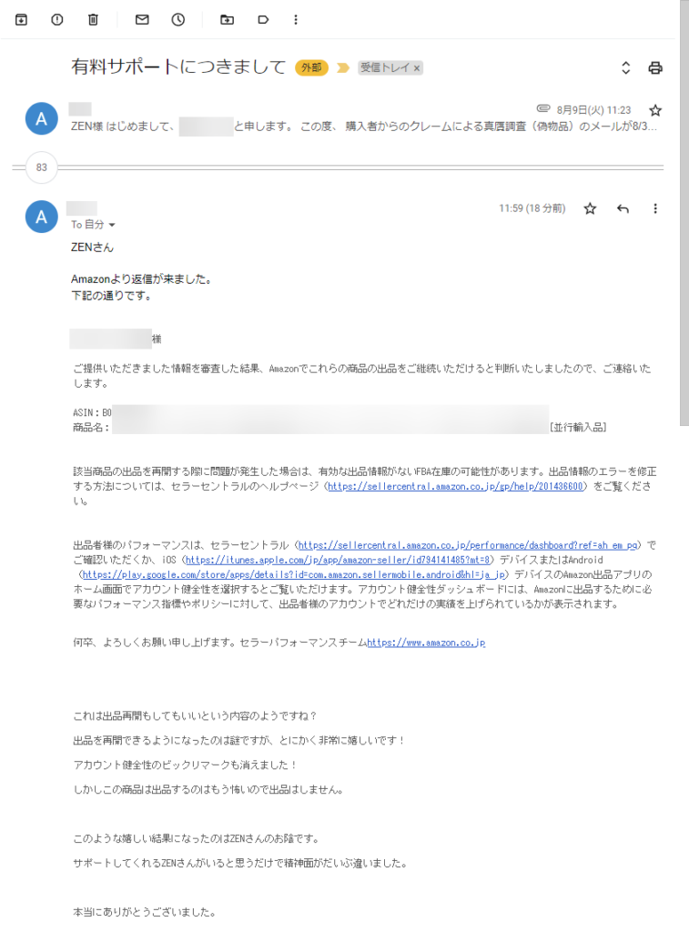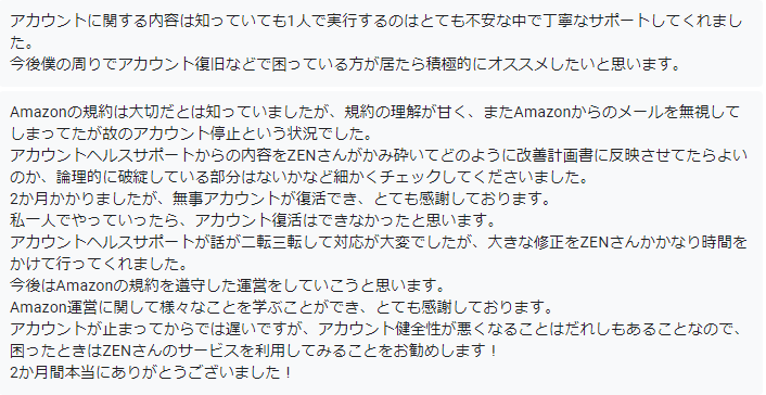 当サービスはアカウントヘルス問題を解決するためのコーチングを個別に提供することがメインの業務ではありますが、利用者が売上を留保されている等、大変な状況の中で在るにも関わらず、利用者様にコスト面で負担がかかりすぎていると私は考えています。しかも、解決できるという保証もありません。解決の保証もないサービスに依頼してくれる人の気持ちを考えると、今までずっと、このサービス提供と料金設定が私の悩みの一つでした。それでも利用していただいたクライアント様には感謝しております。